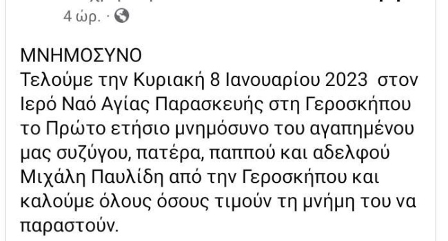 Η ανακοίνωση της οικογένειας για το πρώτο ετήσιο μνημόσυνο του τεως Δημάρχου Γεροσκήπου, Μιχάλη Παυλίδη.