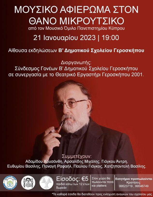 “Θέλω να δω τ’ άσπρο του κόσμου μέσα απ’ τα μάτια ενός πιτσιρικά να ημερέψω λίγο φως μου”. Μουσική βραδιά – αφιέρωμα στον μεγάλο τραγουδοποιό Θάνο Μικρούτσικο, από τον Μουσικό Όμιλο του Πανεπιστημίου Κύπρου, διοργανώνει ο Σύνδεσμος Γονέων και Κηδεμόνων του Δημοτικού Σχολείου Γεροσκήπου Β’ το Σάββατο 21 Ιανουαρίου 2023 στις 7 το βράδυ στην αίθουσα εκδηλώσεων του σχολείου, με τη στήριξη του Θεατρικού Εργαστηρίου Γεροσκήπου.