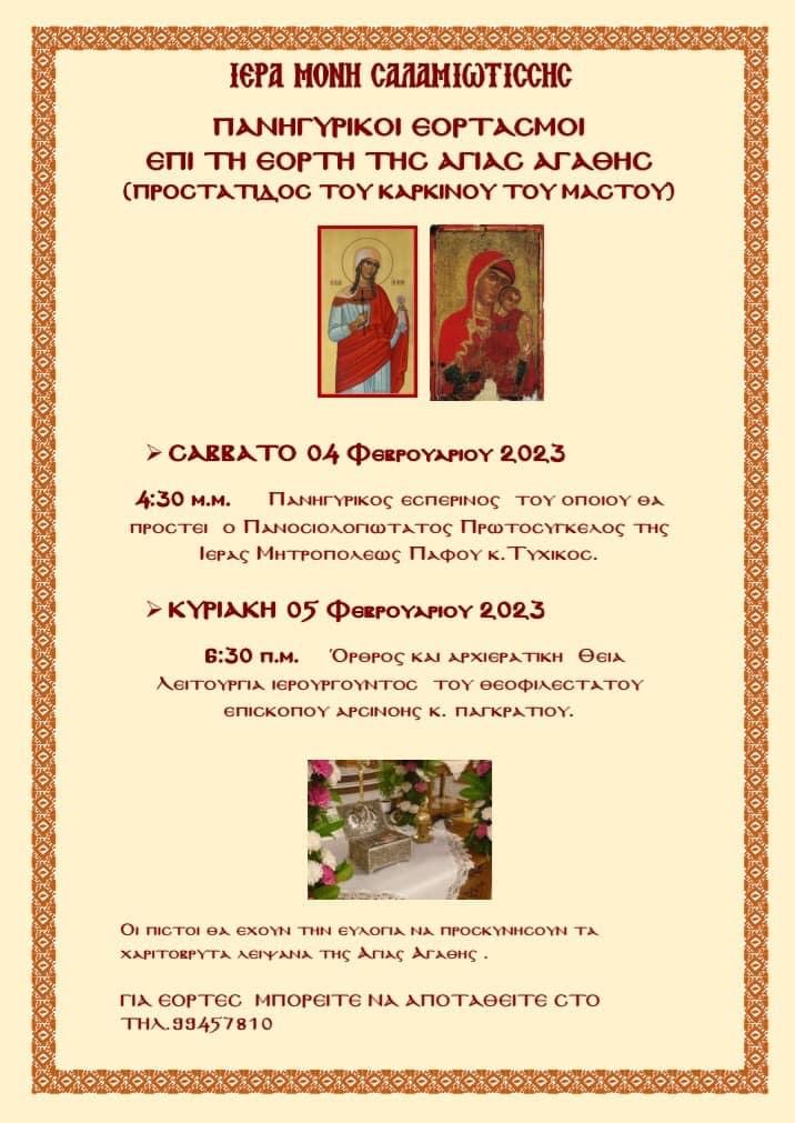 Το Σάββατο 4 και την Κυριακή 5 Φεβρουαρίου θα πραγματοποιηθεί πανηγυρικοί εορτασμοί για τη γιορτή της Αγίας Σκεπης προστάτιδας του καρκίνου του μαστού.