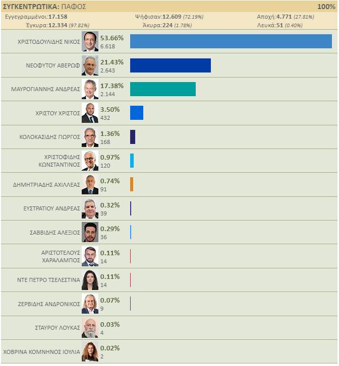 Ο Νίκος Χριστοδουλίδης συγκέντρωσε 6,618 (53,66%) ψήφους και αναδείχθηκε πρώτος στην επαρχία του. Μετά…ακολουθεί η αποχή με 4,771 ψήφους, 27,81%.