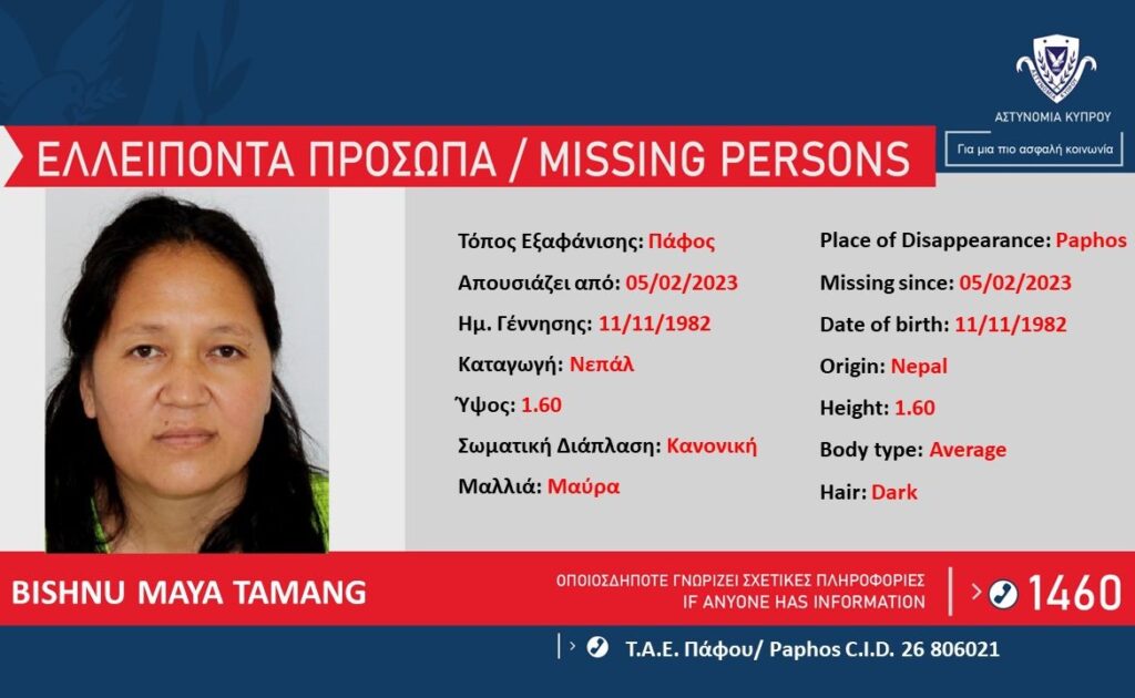 Η Αστυνομία ζητά πληροφορίες, που μπορούν να βοηθήσουν στον εντοπισμό της BISHNU MAYA TAMANG, 40 ετών, από το Νεπάλ, η οποία ελλείπει από το χώρο διαμονής της, στην Πάφο, από το πρωί της 5ης Φεβρουαρίου 2023.