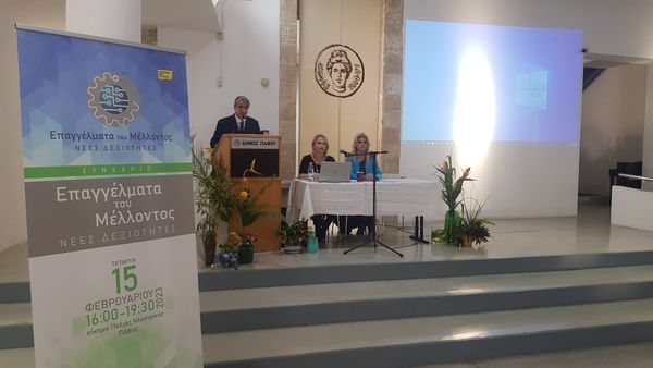 Στο θέμα Επαγγέλματα του Μέλλοντος και Νέες Δεξιότητες: Βιομηχανία Τουρισμού και Φιλοξενίας, αναφέρθηκε η Δρ. Σωτηρούλα Λιασίδου, Επίκουρη καθηγήτρια, στο Τεχνολογικό Πανεπιστήμιο Κύπρου ενώ το θέμα Νέες Τεχνολογίες στην Εnginο και Νέα Επαγγέλματα, κάλυψε ο κ. Κώστας Σίσαμος.