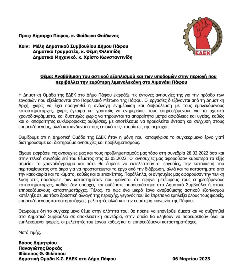 Η δημοτική ομάδα της ΕΔΕΚ Πάφου μέσα από επιστολή που απέστειλε στον Δήμο Πάφου εκφράζει έντονα τις ανησυχίες της για τα έργα που γίνονται στο παραλιακό μέτωπο Πάφου.