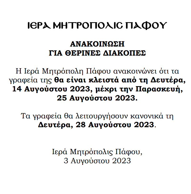 Η Ιερά Μητρόπολη Πάφου ανακοινώνει ότι τα γραφεία της θα είναι κλειστά απο τη Δευτέρα, 14 Αυγούστου 2023, μέχρι την Παρασκευή, 25 Αυγούστου 2023.