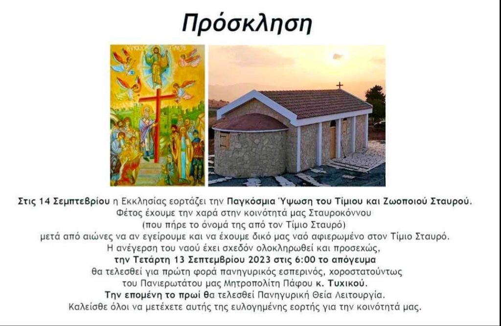 Την Τετάρτη 13 Σεπτεμβρίου θα τελεσθεί για πρώτη φορά πανηγυρικός εσπερινός στη παρουσία του Μητροπολίτη Πάφου Τυχικού και την επόμενη το πρωί στις 14 Σεπτεμβρίου η Πανηγυρική Θεία Λειτουργία.