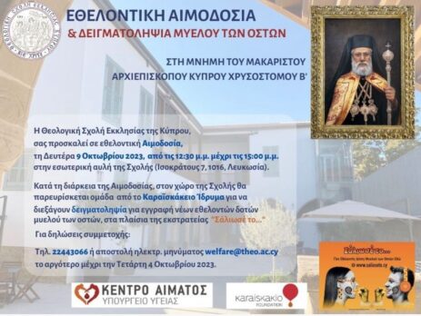 Η Θεολογική Σχολή Εκκλησίας της Κύπρο, σας προσκαλεί σε εθελοντική Αιμοδοσία εις μνήμη του Μακαριστού Αρχιεπισκόπου Κύπρου Χρυσοστόμου Β’, τη Δευτέρα, 9 Οκτωβρίου 2023, από τις 12:30 μ.μ. μέχρι τις 15:00 μ.μ.στην εσωτερική αυλή της Σχολής (Ισοκράτους 7, 1016, Λευκωσία).