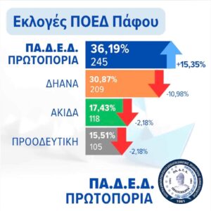 Οι εκλογές της ΠΟΕΔ 30ης Μαΐου 2024 ανήκουν στην ιστορία του συνδικαλιστικού μας κινήματος. Για πρώτη φορά ο εκπαιδευτικός κόσμος της αγαπημένης μας Πάφου δίνει την ευκαιρία στα στελεχη της ΠΑΔΕΔ ΠΡΩΤΟΠΟΡΙΑ να ηγηθούν του Επαρχιακού Γραφείου ΠΟΕΔ ΠΑΦΟΥ. Το αποτέλεσμα μας γεμίζει χαρά και περηφάνια αλλά και ΕΥΘΥΝΗ. Σας ευχαριστούμε για την εμπιστοσύνη και σας υποσχόμαστε πολλή δουλειά για να δικαιώσουμε τις προσδοκίες σας.