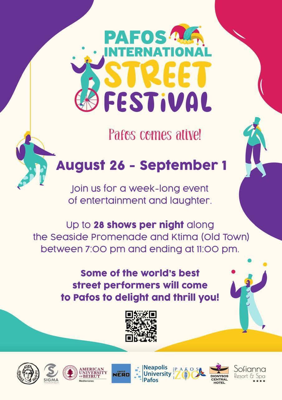 Το Pafos International Street Festival υπόσχεται μια συναρπαστική γιορτή πολιτιστικής δημιουργίας και καλλιτεχνικής έκφρασης. Με ένα πλούσιο πρόγραμμα παραστάσεων, εκθέσεων και διαδραστικών δραστηριοτήτων, το φεστιβάλ στοχεύει να φέρει κοντά ανθρώπους από όλα τα κοινωνικά στρώματα, προσφέροντάς τους  μια μοναδική ευκαιρία να γνωρίσουν την Τέχνη σε ένα ζωντανό και προσβάσιμο περιβάλλον.