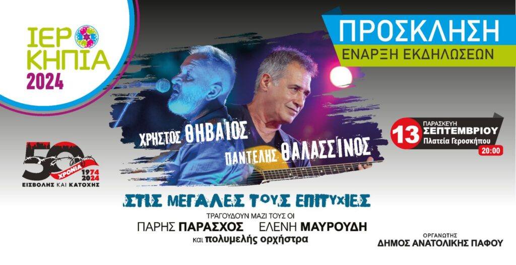 Κατά την έναρξη των Ιεροκηπίων χθες δόθηκε συναυλία με τους Χρίστο Θηβαίο και Παντελή Θαλασσινό. Μαζί τους ο Πάρης Παράσχος, η Ελένη Μαυρουδή και πολυμελής ορχήστρα.