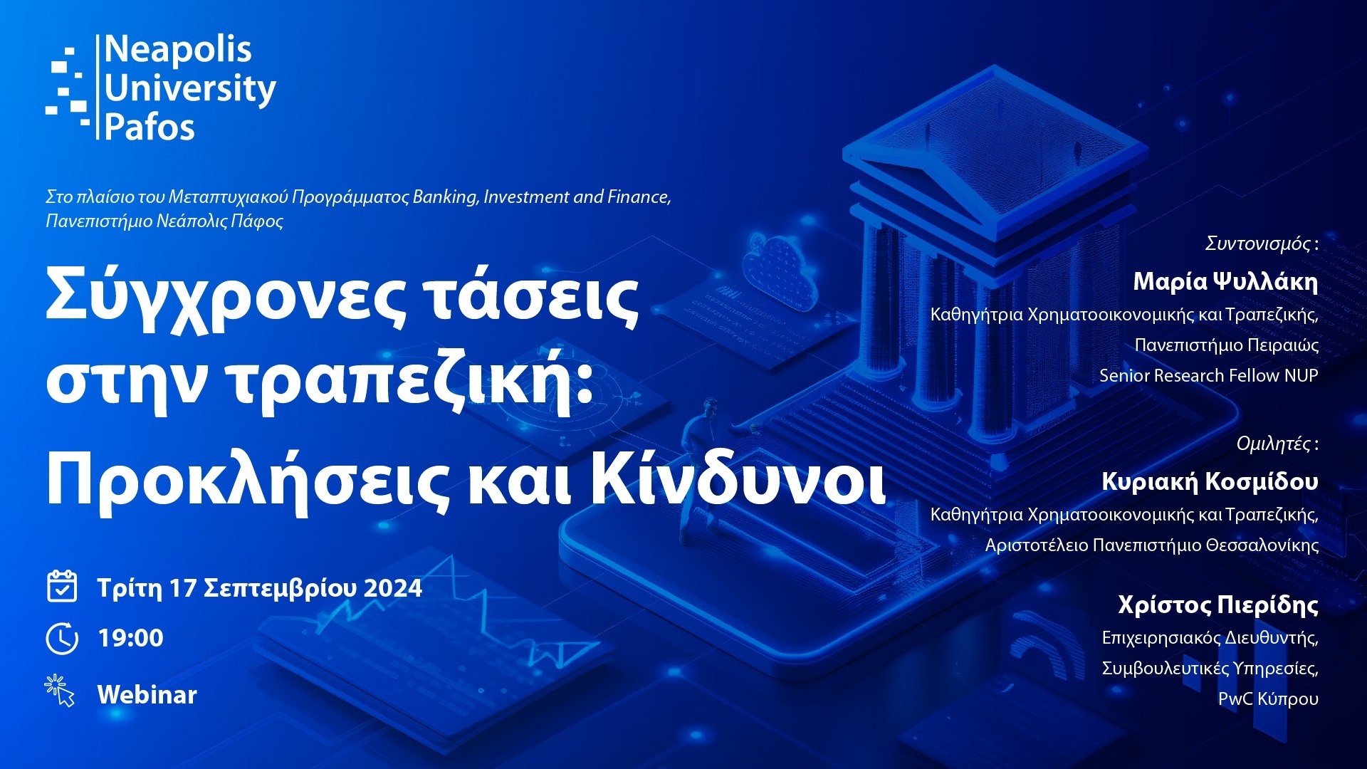 Το Πανεπιστήμιο Νεάπολις Πάφος, στο πλαίσιο του Μεταπτυχιακού Προγράμματος Banking, Investment and Finance, διοργανώνει την Τρίτη, 17 Σεπτεμβρίου 2024, στις 19:00 διαδικτυακό σεμινάριο (webinar) με τίτλο «Σύγχρονες τάσεις στην τραπεζική: Προκλήσεις και Kίνδυνοι»,