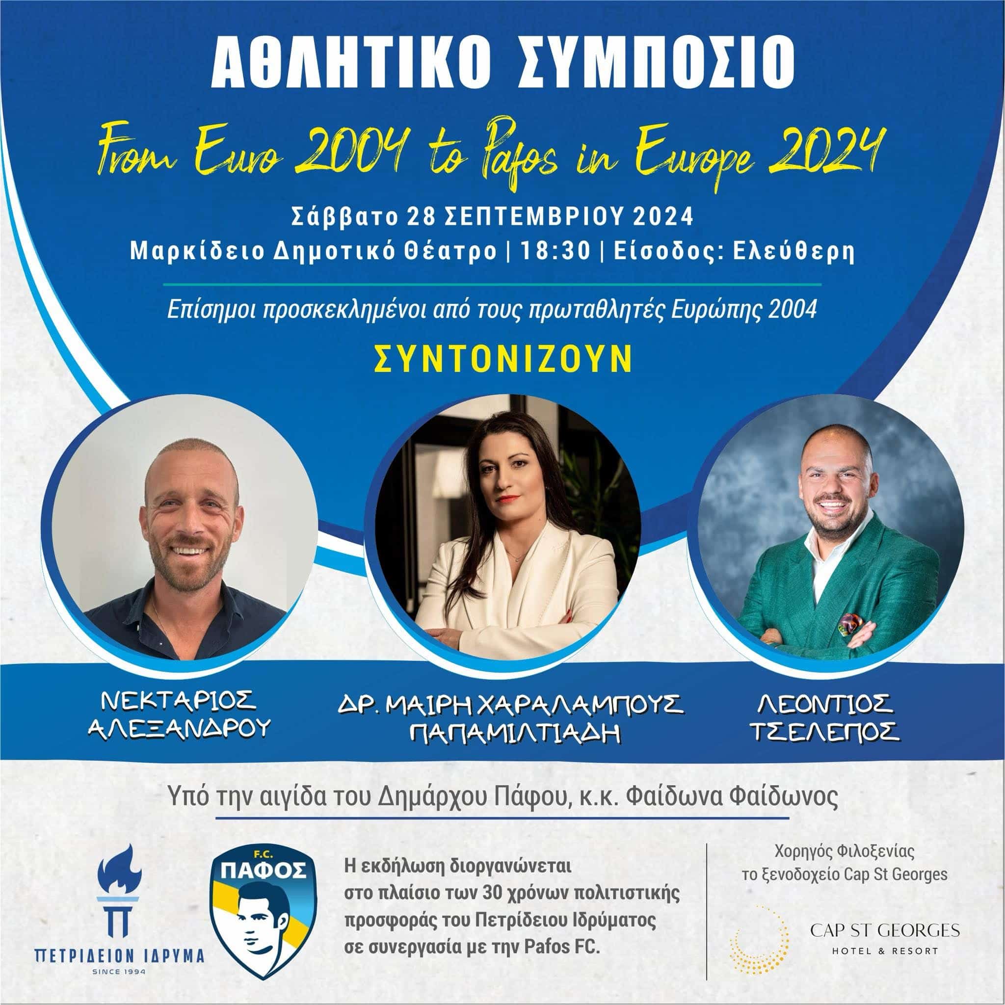 Σύμφωνα με ανακοίνωση του Πετριδείου Ιδρύματος, το Πετρίδειο Ίδρυμα, στο πλαίσιο της συμπλήρωσης 30 χρόνων προσφοράς του στον Αθλητισμό, την Παιδεία και τον Πολιτισμό, συνδιοργανώνει με την ποδοσφαιρική ομάδα της επαρχίας Pafos FC με τίτλο «FromEuro 2004 to Pafos in Europe 2024». Το συμπόσιο θα πραγματοποιηθεί το Σάββατο, 28Σεπτεμβρίου 2024, στοΜαρκίδειο Δημοτικό Θέατρο στην Πάφο, στις 18:30.