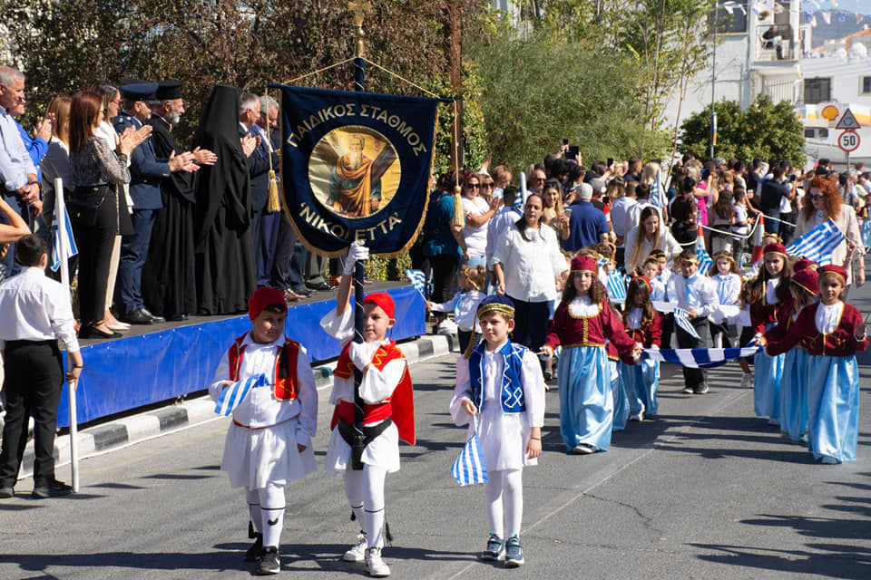 Ακολούθησε παρέλαση στην οποία συμμετείχαν μαθητές και μαθήτριες από δημόσια και ιδιωτικά εκπαιδευτήρια Προδημοτικής, Δημοτικής, Μέσης και Τεχνικής Εκπαίδευσης από ολόκληρη την περιφέρεια Πόλης Χρυσοχούς.