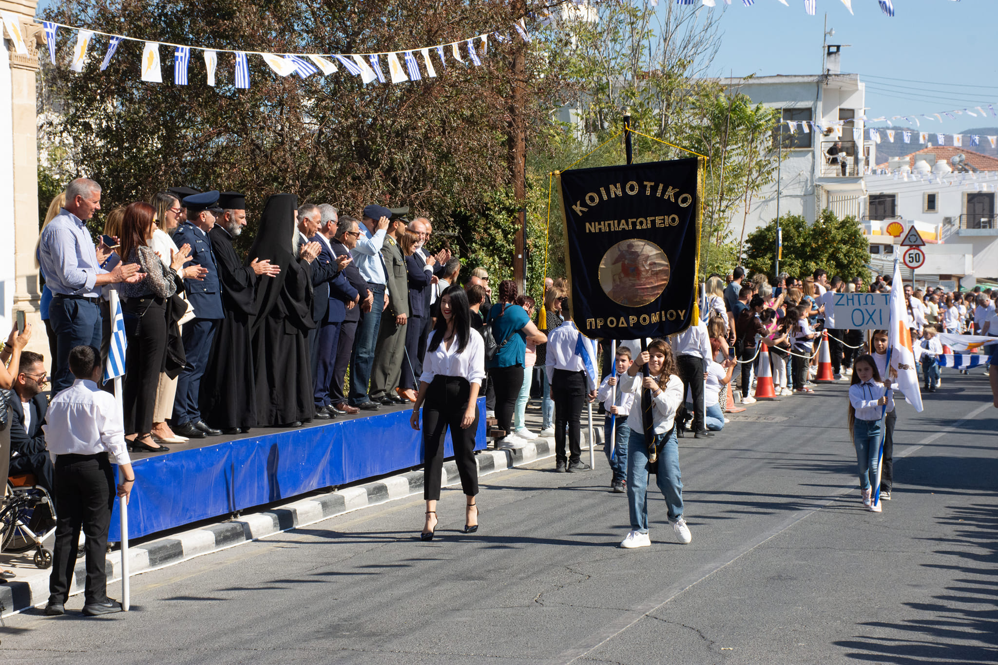 Τον χαιρετισμό της παρέλασης δέχτηκε ο Πρίεδρος του ΕΟΑ Πάφου, κ. Πιττοκοπίτης, ο Δήμαρχος και μέλη του Δημοτικού Συμβουλίου Πόλης, ο Βουλευτής ΕΔΕΚ, κ. Μυριάνθους και λοιποί επίσημοι.
