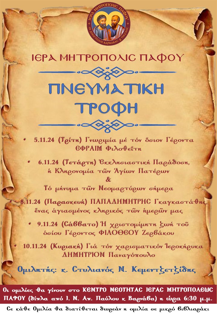 Η Ιερά Μητροπόλις Πάφου διοργανώνει σειρά ομιλιών με τα ακόλουθα θέματα: