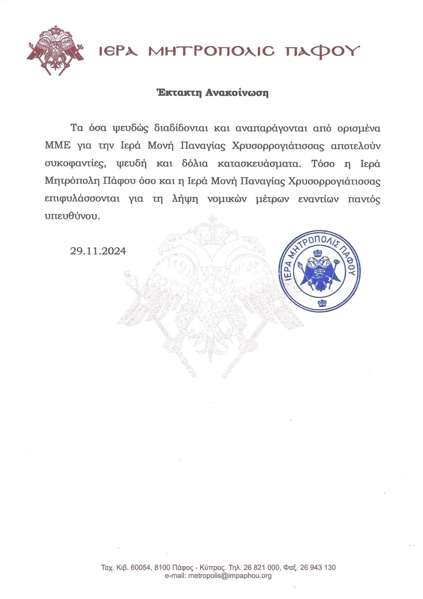 Έκτακτη Ανακοίνωση Ιεράς Μητροπόλεως Πάφου και Μονής Χρυσορρογιατίσσης