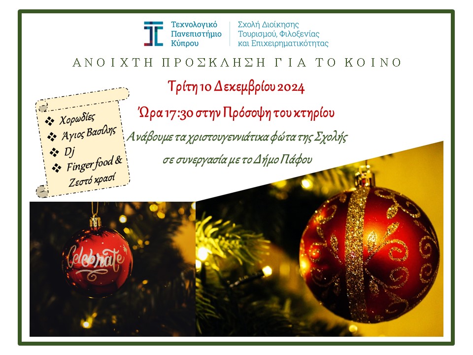 Η Σχολή Διοίκησης Τουρισμού, Φιλοξενίας και Επιχειρηματικότητας του Τεχνολογικού Πανεπιστημίου Κύπρου γιορτάζει τα δεύτερα Χριστούγεννα της στην Πάφο, μια μοναδική γιορτή για όλους γεμάτη χαρά και μουσική.