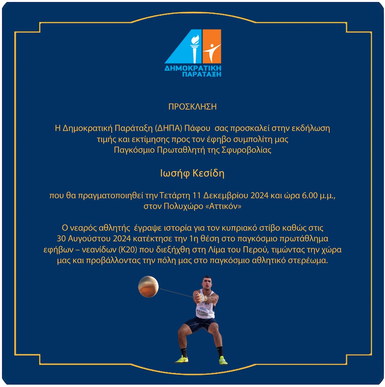Η Δημοκρατική Παράταξη (ΔΗ.ΠΑ.) Πάφου, οργανώνει την Τετάρτη 11 Δεκεμβρίου 2024 και ώρα 6.00 μ.μ., στον Πολυχώρο «Αττικόν», μεγάλη εκδήλωση για να τιμήσει τον έφηβο συμπολίτη μας Παγκόσμιο Πρωταθλητή της Σφυροβολίας Ιωσήφ Κεσσίδη.