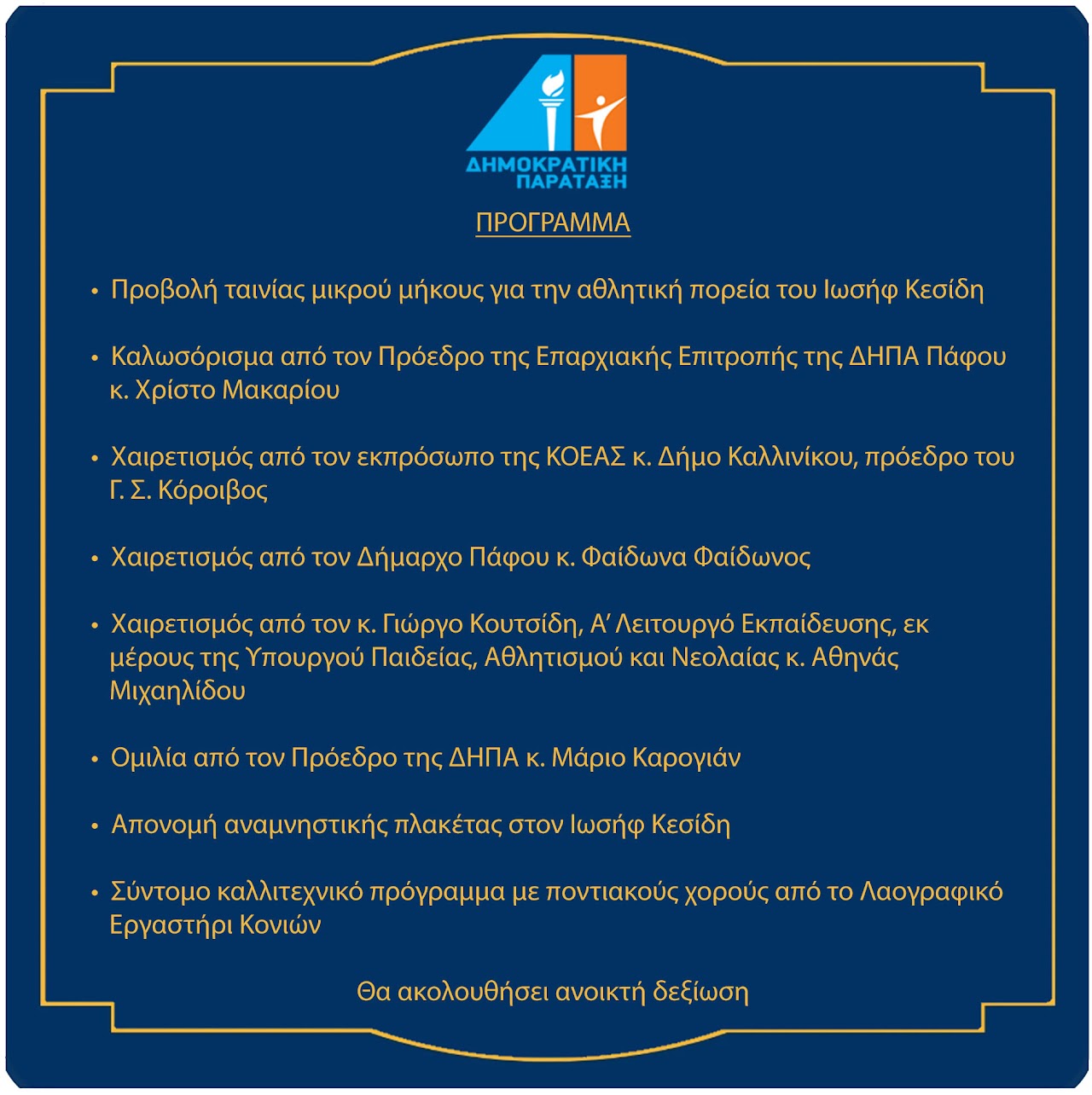 - Προβολή ταινίας μικρού μήκους για την αθλητική πορεία του Ιωσήφ Κεσίδη