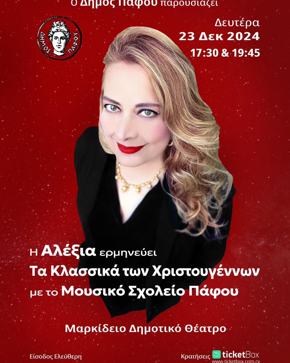 Ο Δήμος Πάφου και το Μουσικό Σχολείο Πάφου, ενώνουν τις δυνάμεις τους για μία ξεχωριστή Χριστουγεννιάτικη συναυλία με την Αλέξια που οργανώνεται στο πλαίσιο της ετήσιας Χριστουγεννιάτικης εκδήλωσης του Δήμου Πάφου.