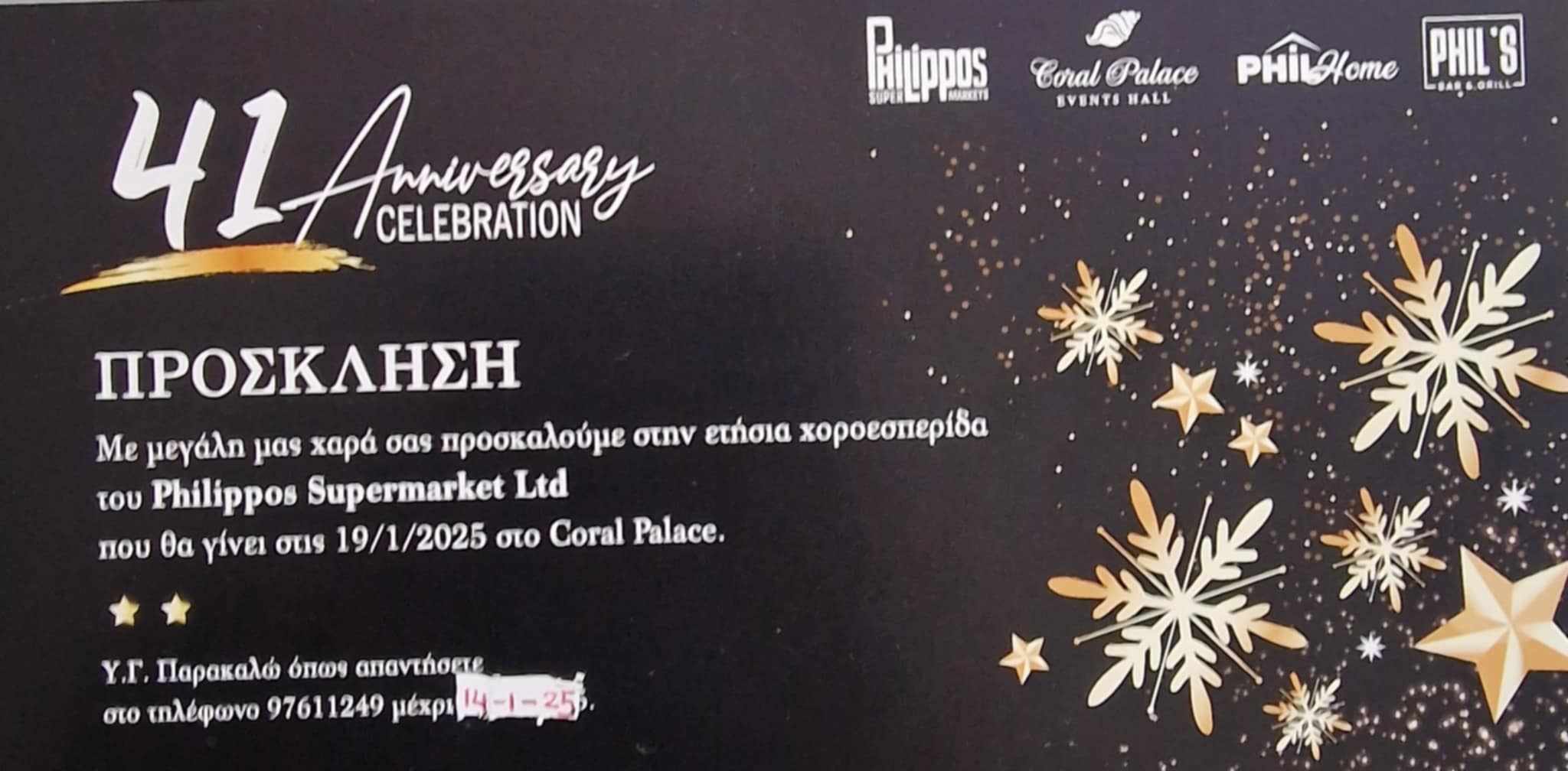Τα καταστήματα Philippos Supermarket Ltd σας προσκαλούν στην ετήσια χοροεσπερίδα με την ευκαιρία των 41 χρόνων προσφοράς.