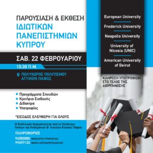 Ο Σύνδεσμος Γονέων και Κηδεμόνων του Β’ Λυκείου Κύκκου Πάφου, διοργανώνουν Παρουσίαση και Έκθεση ιδιωτικών Πανεπιστημίων το Σάββατο 22 Φεβρουαρίου στον Πολυχώρο Πολιτισμού Αττικόν στην Πάφο.