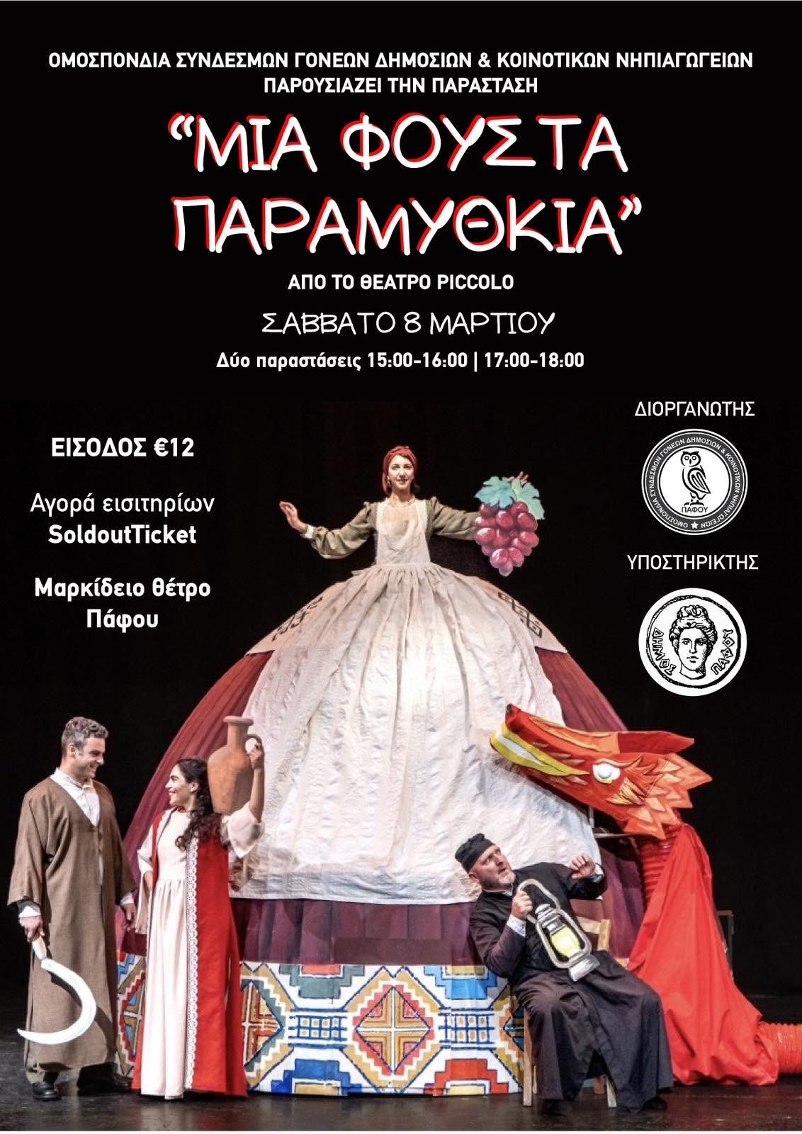 Η Ομοσπονδία Δήμόσιων και Κοινοτικών Νηπιαγωγείων Πάφου διοργανώνει την πετυχημένη θεατρική Παράσταση “Μια Φούστα Παραμύθκια ‘’ στο Μαρκίδειο Θέατρο Κυριακή 8 Μαρτίου.