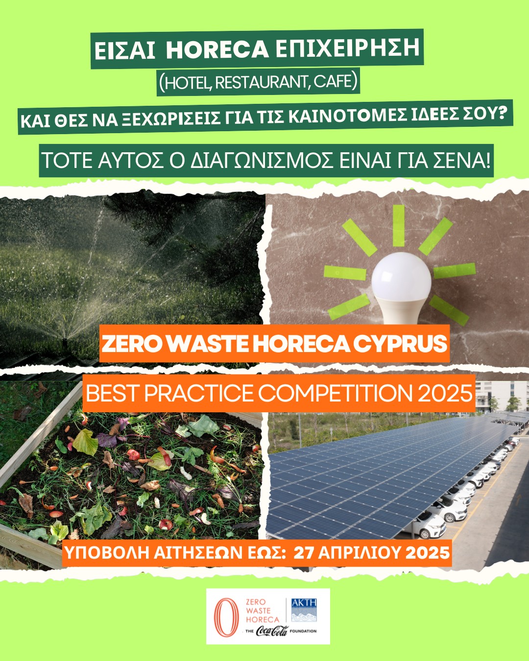 Το Κέντρο Μελετών και Έρευνας ΑΚΤΗ, με την υποστήριξη του Ιδρύματος της Coca-Cola (The Coca-Cola Foundation), ανακοινώνει τον διαγωνισμό ‘‘Zero Waste HoReCa Cyprus Champions 2024- Best Practice Competition’’! Μικρές και μεγάλες τουριστικές επιχειρήσεις της Κύπρου θα βραβευτούν για τις δράσεις που υλοποιούν προς την πράσινη μετάβαση τους.
