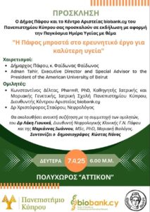 Με αφορμή την Παγκόσμια Ημέρα Υγείας, προσκαλείστε στην εκδήλωση«Η Πάφος μπροστά στο ερευνητικό έργο για καλύτερη υγεία» απόψε Δευτέρα 7.4.2025 στις 6:00 μ.μ. στον Πολυχώρο Αττικόν. Συνδιοργάνωση: Δήμος Πάφου & Κέντρο Αριστείας Πανεπιστημίου Κύπρου biobank.cy. Θα ακολουθήσει ανοιχτή συζήτηση.