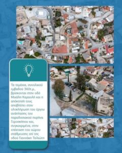 Τα τεμάχια, συνολικού εμβαδού 360τ.μ., βρίσκονται στην οδό Μιχάλη Καραολή και η απόκτησή τους αποβλέπει στην ολοκλήρωση του έργου ανάπλασης του παραδοσιακού πυρήνα Γεροσκήπου και, συγκεκριμένα, στην επέκταση του χώρου στάθμευσης επί της οδού Γιαννάκη Ταλιώτη (έναντι της Δημοτικής Πινακοθήκης).