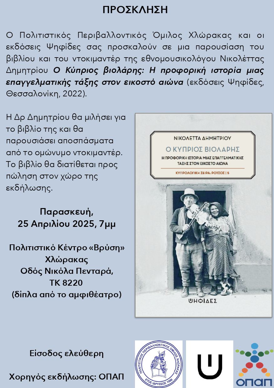 🍂Ο ΚΥΠΡΙΟΣ ΒΙΟΛΑΡΗΣ – Μια παρουσίαση του Βιβλίου και ντοκιμαντέρ της Εθνομουσικολόγου Δρ Νικολέττας Δημητρίου, την Παρασκευή 25 Απριλίου στις7:00 μμ στο πολιτιστικό κέντρο «Βρύση» Χλώρακας