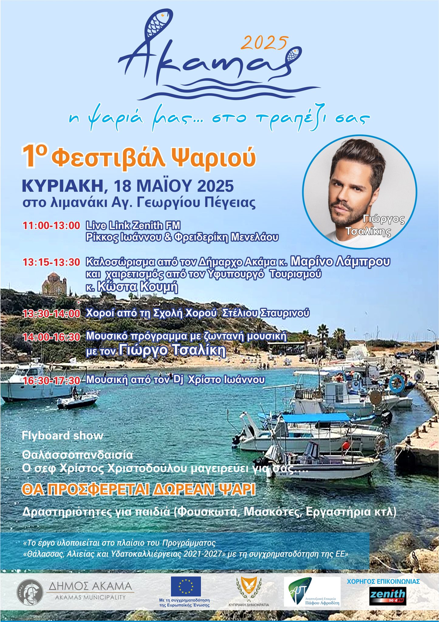 Ο Δήμος Ακάμα διοργανώνει το 1ο Φεστιβάλ Ψαριού την Κυριακή 18 Μαΐου 2025 στο γραφικό λιμανάκι του Αγίου Γεωργίου Πέγειας.
