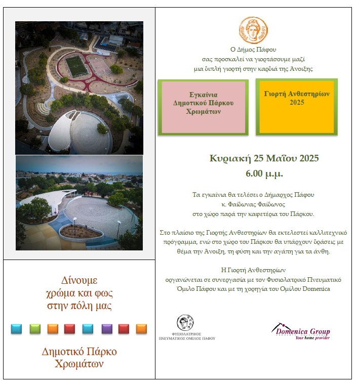 Την Κυριακή, 25 Μαΐου 2025, στις 6.00 μ.μ., θα πραγματοποιηθούν τα εγκαίνια του Δημοτικού Πάρκου Χρωμάτων, ενός σύγχρονου χώρου αναψυχής και πολιτισμού, ο οποίος αποτελεί πλέον σημείο αναφοράς για την πόλη της Πάφου. Τα εγκαίνια θα τελέσει ο Δήμαρχος Πάφου κ. Φαίδωνας Φαίδωνος, στον χώρο μπροστά από την καφετέρια του Πάρκου.
