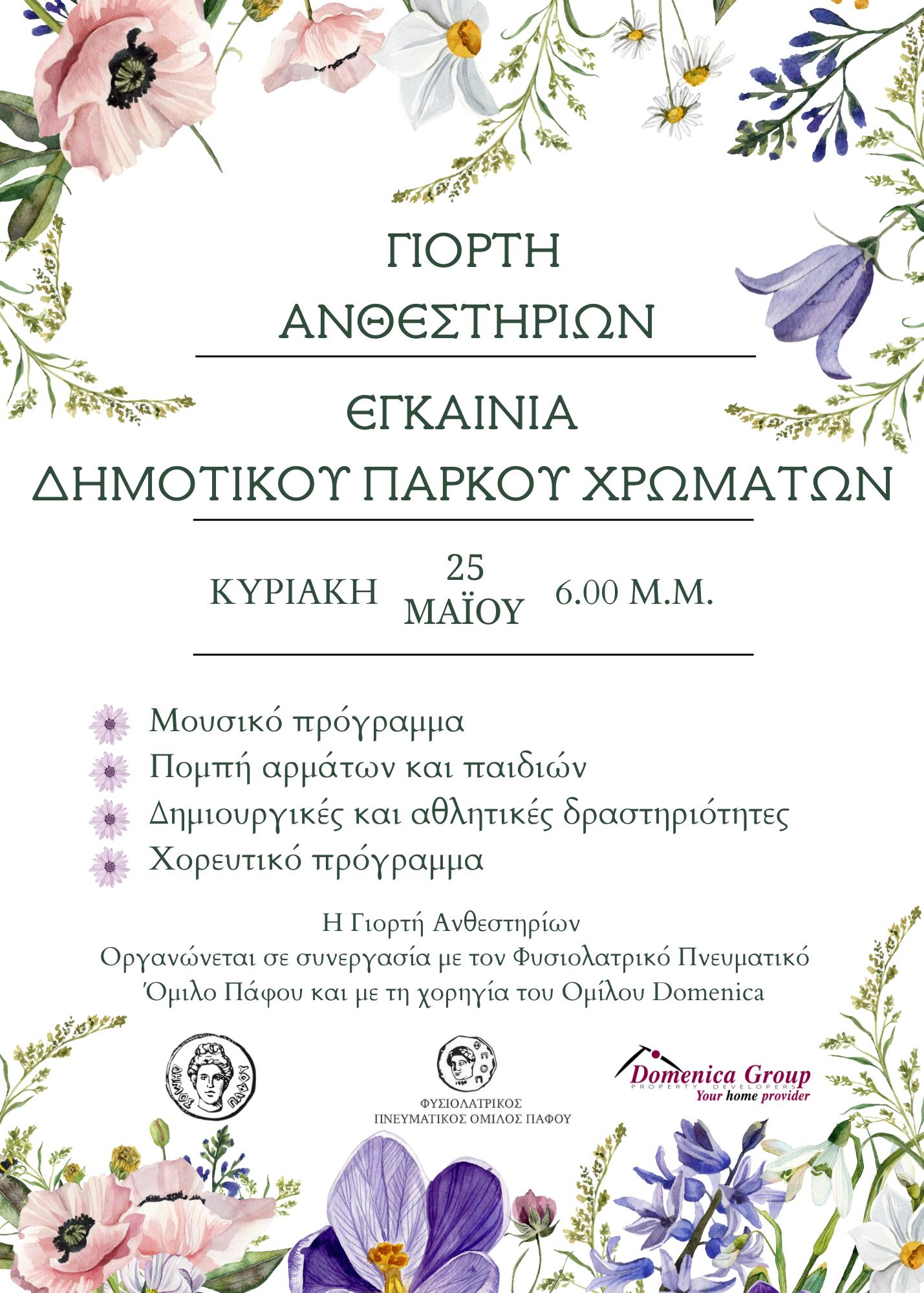 Η Γιορτή Ανθεστηρίων 2025 συνδιοργανώνεται με τον Φυσιολατρικό Πνευματικό Όμιλο Πάφου και τελεί υπό την ευγενική χορηγία του Ομίλου Domenica.