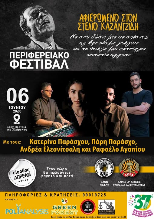 Η ΕΔΟΝ Πάφου και οι Λαϊκές Οργανώσεις Χλώρακας & Κισσόνεργας σας προσκαλούν στο Περιφερειακό Φεστιβάλ αφιερωμένο στον Στέλιο Καζαντζίδη.