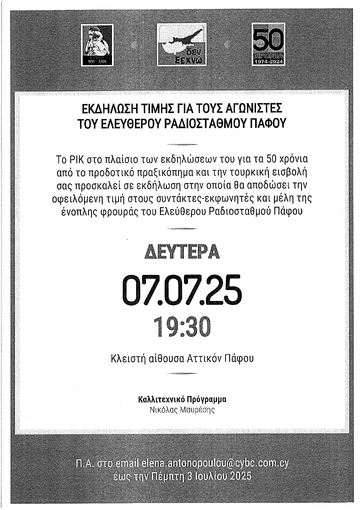 Θα τιμηθεί ο δημιουργός του Ελεύθερου Ραδιοσταθμού της Πάφου Νίκος Νικολαΐδης, οι συντάκτες – εκφωνητές του καθώς και τα μέλη της ένοπλης Φρουράς.