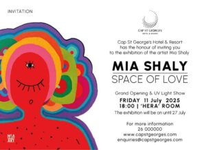Στις 11 Ιουλίου, σας περιμένουμε στο Cap St Georges Hotel & Resort στην Πάφο για τα εγκαίνια της έκθεσης Space of Love, της διεθνούς καλλιτέχνιδας Mia Shaly, που ζει και δημιουργεί στην Κύπρο. Τα έργα της κοσμούν ιδιωτικές συλλογές στην Κύπρο και στο εξωτερικό.