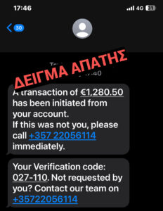 Η Υποδιεύθυνση Ηλεκτρονικού Εγκλήματος Αρχηγέιου Αστυνομίας, έχει δεχθεί το τελευταίο διάστημα αυξημένο αριθμό καταγγελιών από πολίτες, αναφορικά με παραπλανητικά τηλεφωνικά μηνύματα (SMS) που αποστέλλονται μαζικά και εμφανίζονται ψευδώς ως προερχόμενα από τραπεζικούς οργανισμούς. Τα εν λόγω μηνύματα συνήθως περιλαμβάνουν δήθεν πληροφορίες για ανεξουσιοδότητες συναλλαγές ή κωδικούς επιβεβαίωσης και καλούν τον παραλήπτη να επικοινωνήσει με συγκεκριμένο αριθμό τηλεφώνου. Πρόκειται για κακόβουλες ενέργειες με σκοπό την απόσπαση ευαίσθητων προσωπικών ή/και τραπεζικών δεδομένων και χρηματικών ποσών. Συστάσεις προς το κοινό: Μην καλείτε αριθμούς τηλεφώνου που αναφέρονται σε ύποπτα ή ανεπιθύμητα μηνύματα. Μην κοινοποιείτε προσωπικά ή τραπεζικά στοιχεία μέσω τηλεφώνου ή γραπτού μηνύματος. Επικοινωνήστε άμεσα με την τράπεζά σας, μόνο μέσω των επίσημων καναλιών (π.χ. τηλεφωνικό κέντρο, επίσημη εφαρμογή). Καταγγείλετε κάθε τέτοιο περιστατικό στην Υποδιεύθυνση Ηλεκτρονικού Εγκλήματος, στο τηλέφωνο 22808200. Η πρόληψη ξεκινά από την ενημέρωση. Μείνετε σε εγρήγορση και προστατέψτε τα προσωπικά και τραπεζικά σας δεδομένα από κακόβουλες ενέργειες.