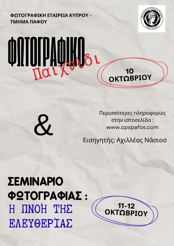 Ένα ταχύρυθμο workshop στο οποίο οι συμμετέχοντες έρχονται σε επαφή με την φωτογραφική διαδικασία παίζοντας. Στο Φωτογραφικό Παιχνίδι θα γευτούμε το συνολικό περιεχόμενο της φωτογραφικής διαδικασίας: Λήψη-Επιλογή-Επεξεργασία-Σύνταξη εικόνων, εξασκώντας την εγρήγορση που απαιτεί η λήψη σε συνδυασμό με την ιδέα που χρειάζεται ένα θέμα για να είναι ενδιαφέρον.