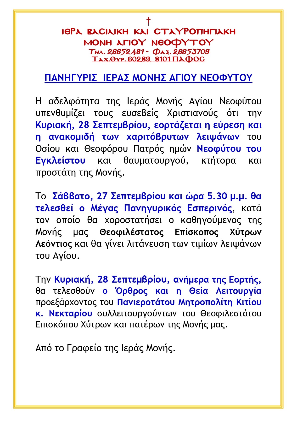 Η Ιερά Μονή καλεί το ευσεβές κοινό να συμμετάσχει στις λατρευτικές εκδηλώσεις, τιμώντας τον Άγιο Νεόφυτο, έναν από τους σημαντικότερους πνευματικούς πυλώνες της Κυπριακής Ορθοδοξίας, του οποίου η ζωή και το έργο συνεχίζουν να εμπνέουν πιστούς και ερευνητές.