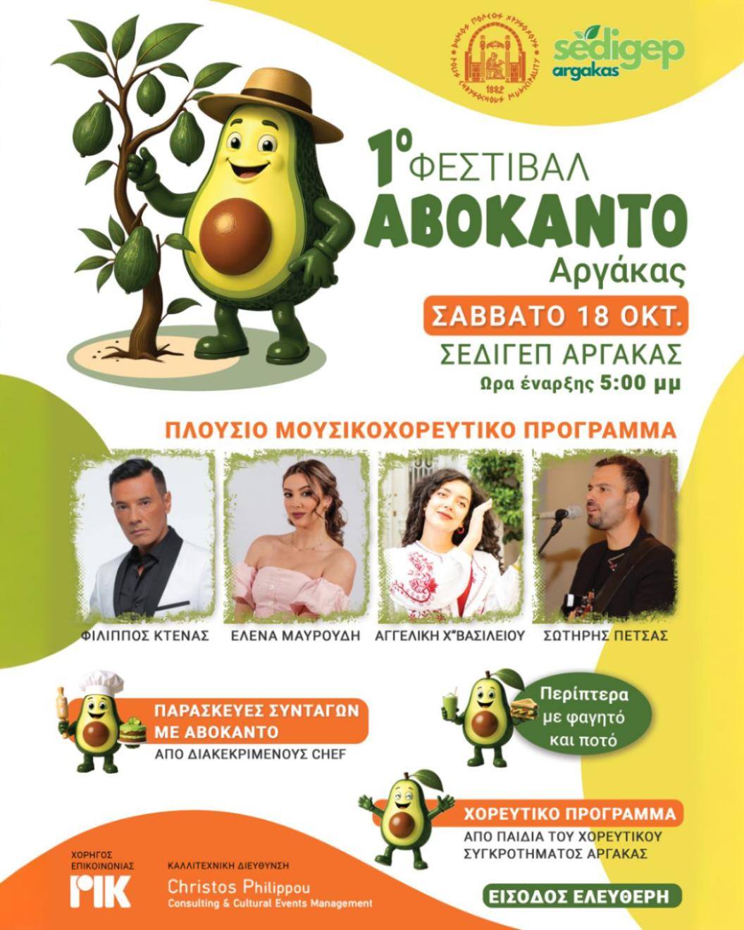 Ο Δήμος Πόλης Χρυσοχούς και η ΣΕΔΙΓΕΠ Αργάκας σας προσκαλούν στο 1ο Φεστιβάλ Αβοκάντο Αργάκας!