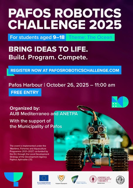 Με τη διοργάνωση του πρώτου ευρείας κλίμακας Μαθητικού Διαγωνισμού Ρομποτικής, που θα πραγματοποιηθεί την Κυριακή 26 Οκτωβρίου 2025 και ώρα 11:00 π.μ. στο Λιμανάκι Πάφου, η Ρομποτική Τεχνολογία εισέρχεται δυναμικά στην Εκπαιδευτική Κοινότητα της πόλης.