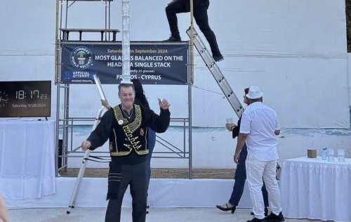 Είκοσι οκτώ γυάλινα ποτήρια ισορρόπησε το ένα πάνω στο άλλο και όλα στο κεφάλι του, ο Πάφιος Αριστοτέλης Βαλαωρίτης καταρρίπτοντας…